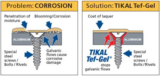 Vlaga, slanost okolja pošpešuje zamenjavo elektronov in takrat se nastajagalvansko rjavenje. To lahko opazimo zelo dobro na aluminijastem jamboru ali inox delih ter alu vijakih . Opazi se kot bel prah na določenih točkah pozneje je to opaziti po celotni površini. Pri nastajanju pod lakirano ovršino je to možno opaziti kot mehučke po barvo.TIKAL TEF-GEL® trajno preprečuje nastajanje galvanske korozije.Tako zaščiti spoje med dvema različnima kovinama in vijake je lahko po zelo dolgem času kljub izpostavljenim ekstremnim razmeram odvijačiti.